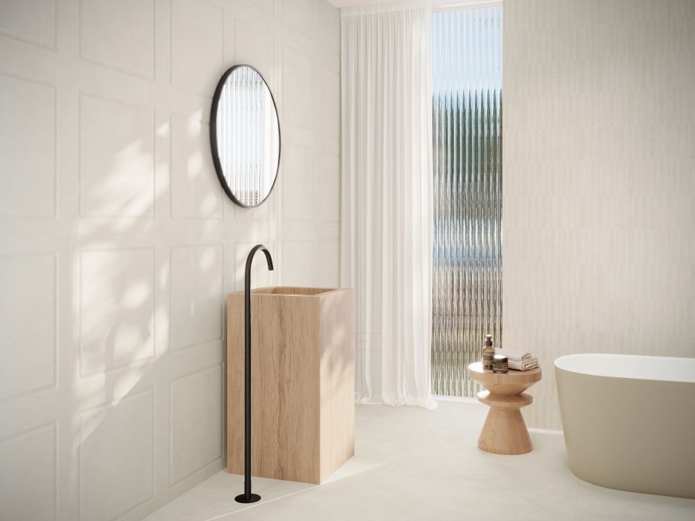 With its geometric reliefs, the Zephyra collection from Ape Grupo is designed to conjure rhythmic depth and serenity thanks to its matte finish, among other subtleties, that evoke a calm environment through continuity. (Image courtesy Ape Grupo)
