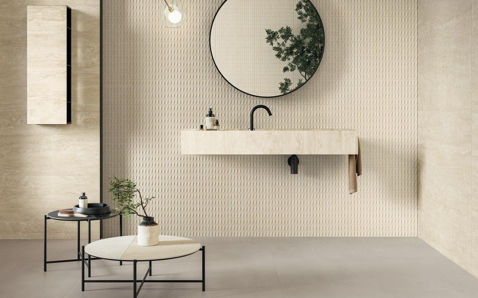 Marvel T is the result of in-depth research into travertine, offering a contemporary and textured interpretation that remains faithful to the elegance and visual impact of natural stone. The three-dimensional surfaces, designed by HBA, amplify texture and character, creating a continuous dialogue between texture and light. ((Image courtesy Atlas Concorde)
