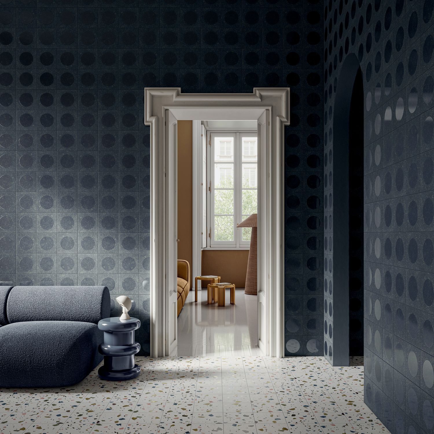 :From Sottocer is Lumen, a new series of ceramic tile, designed to play with light and color, while offering subtle nuances and unexpected contrasts. From the mysterious depth of Nocturne (pictured here), the Lumen series moves effortlessly between understated elegance and bold character. (Image courtesy Sottocer)