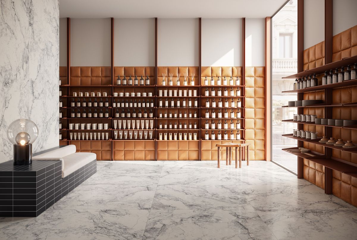 With Serenissima’s Palazzo collection, the textures, and colors of marble strike with architectural realism. The porcelain tiles interpret eight famous marble varieties celebrated for their beauty and versatility. ((Image courtesy Serenissima Ceramiche)