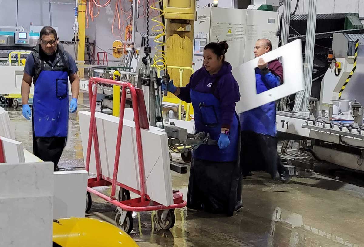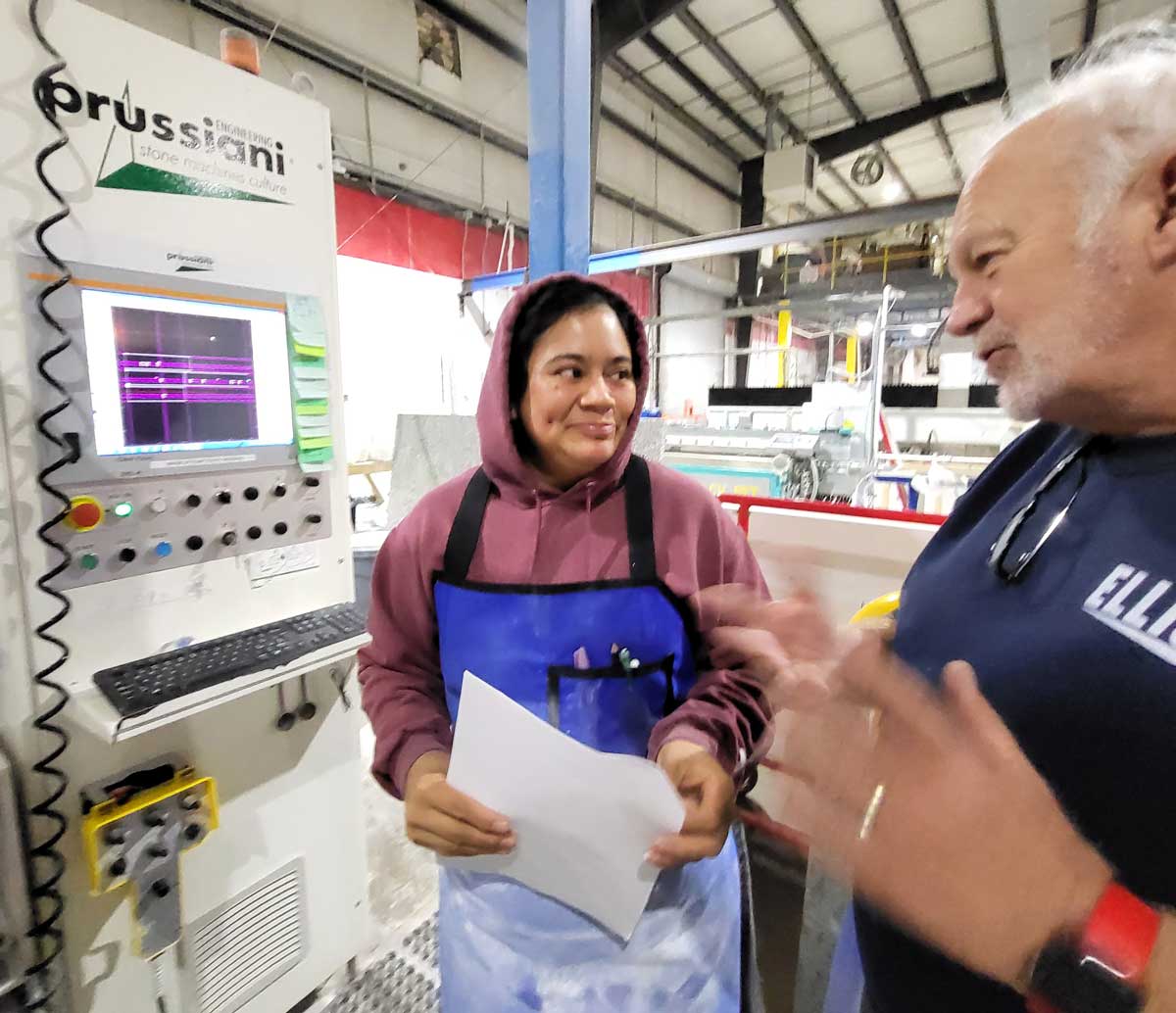 Mr. Page also commented that over the years, besides their occasional changing of workspaces, and the 2009 name change to Ellis Page Company LLC., the business has evolved into something quite different than what it used to be. They do very little solid surface these days and they have transitioned over to 99.9% commercial work. They generally work on projects of a quarter-million-dollars or more. The only residential projects they work on are the occasional requests from the individuals at the companies they partner with. They are a member of the Natural Stone Institute and ISFA. They also belong to the Facebook groups All Slab Fabbers and Women in Stone. As the company has changed, so has their equipment. They still have their solid-surface equipment for the occasional job. However, the company invests heavily in the technological advances of our industry. Their fabrication shop houses a Marmo Meccanica edge polisher, three CNC machines, and two CNCs are dual table machines. They also run two saws: a Champion 5, and a waterjet saw. The CNCs and the saws are all made by Prussiani of Italy. Four years ago, they contracted with Prussiani to build a prototype CNC. It was the first machine of its kind to be built, designed specifically for them. Two years later, they purchased an identical CNC machine to go with the one they already had. And they are now interested in a newer, more advanced saw.