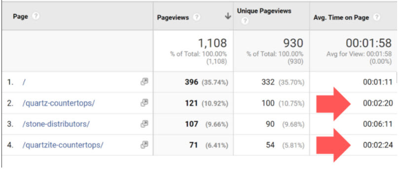 In my December 2022 Slippery Rock article, I spoke about non-traditional ways to grow your countertop shop in 2023. Some of them were focusing on voice search in Google, producing video content, getting uncomfortable, and also going above and beyond with reviews. I truly believe in when marketing your shop, if you put the effort in and do things just a little bit differently from the competition you will see great results. The problem is that you need a solid foundation. Your shop needs the basics and you shouldn’t be focusing on Google voice search results if your website looks like it’s from 1996! So in this article, I’m going to break down what you need in 2023 and what we’ve learned in 2022. We work with dozens of fabricators and we love looking at the data to develop ideas on how to improve our client’s campaigns. Your Website and Material What we’ve learned in 2022 is that people want to look at material on your website. I sound like a broken record with this statement but it’s not what I believe, it’s what the data tells us. We have data from all of our client’s websites on what people visiting their sites are doing online. And every time that we build out a gallery of material on a client’s site, we find that people visiting their site spend a lot of time on those pages. The accompanying screenshot explains it all.
