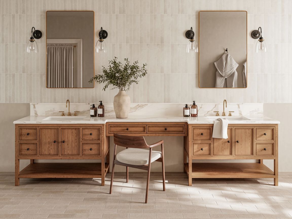 - Bronze/brass: Especially in bathroom hardware and decorative lighting; the metal becomes the visual punctuation.