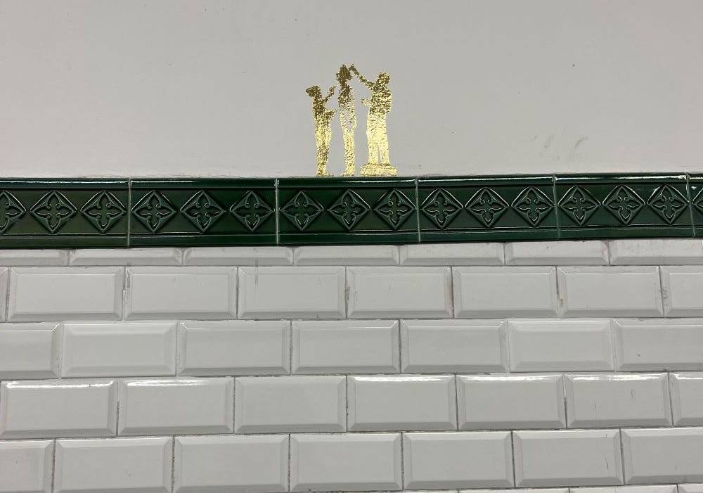:Green and white subway tiles line the walls of Paris’ Opéra metro station, with a bit of gold stenciling for embellishment representing the artists of the Opéra national de Paris, including the dancers, singers, musicians, and orchestral conductors. . (Photo ©2023 Arpi Nalbandian)