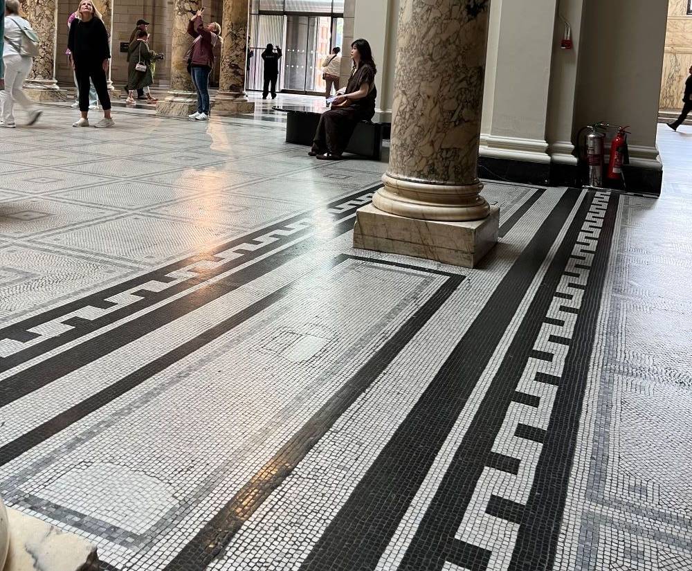 : The foyer/entrance of the Victoria & Albert Museum in South Kensington, London, boasts stately pillars of marble and monotoned stone mosaics on the floor. (Photo ©2023 Arpi Nalbandian)