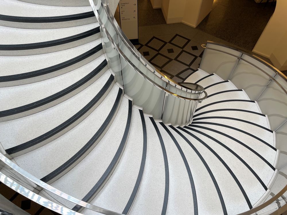 The staircase, located in the Rotunda of the Tate Britain, was reconstructed in 2013 using terrazzo in a pattern that recalls the original marble mosaic floor. (Photo ©2023 Arpi Nalbandian)