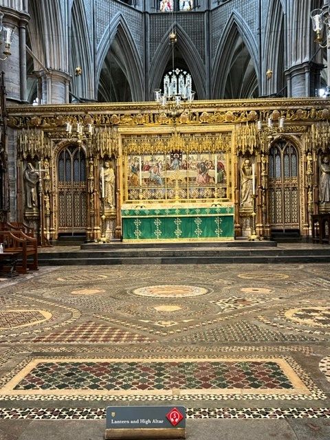 The Cosmati Pavement, located in the altar area of Westminster Abbey, recently underwent large-scale cleaning and preservation efforts — revealing with great detail the various sizes and colors of stone and glass on a bed of dark limestone known as Purbeck marble. (Photo ©2023 Arpi Nalbandian)