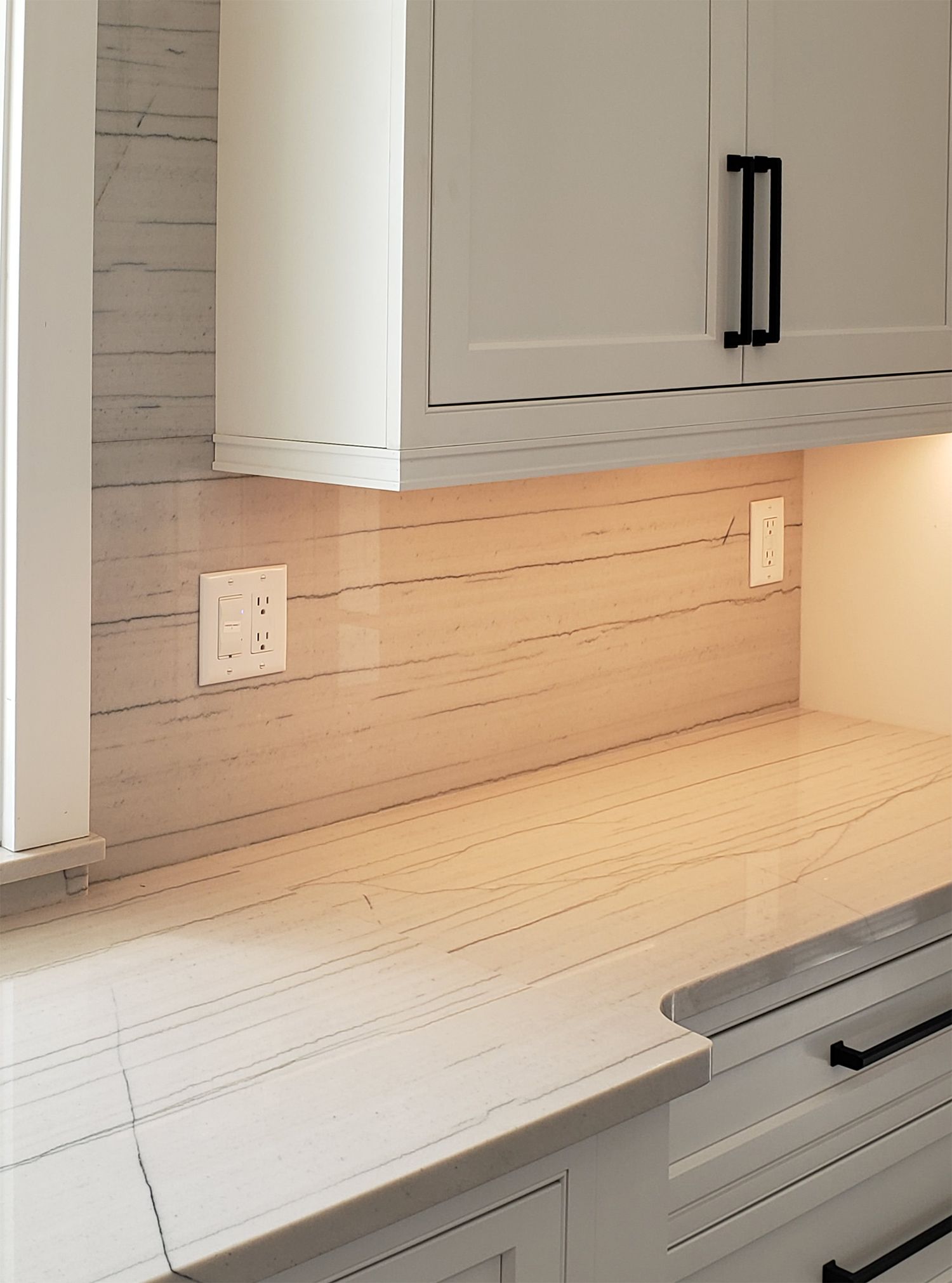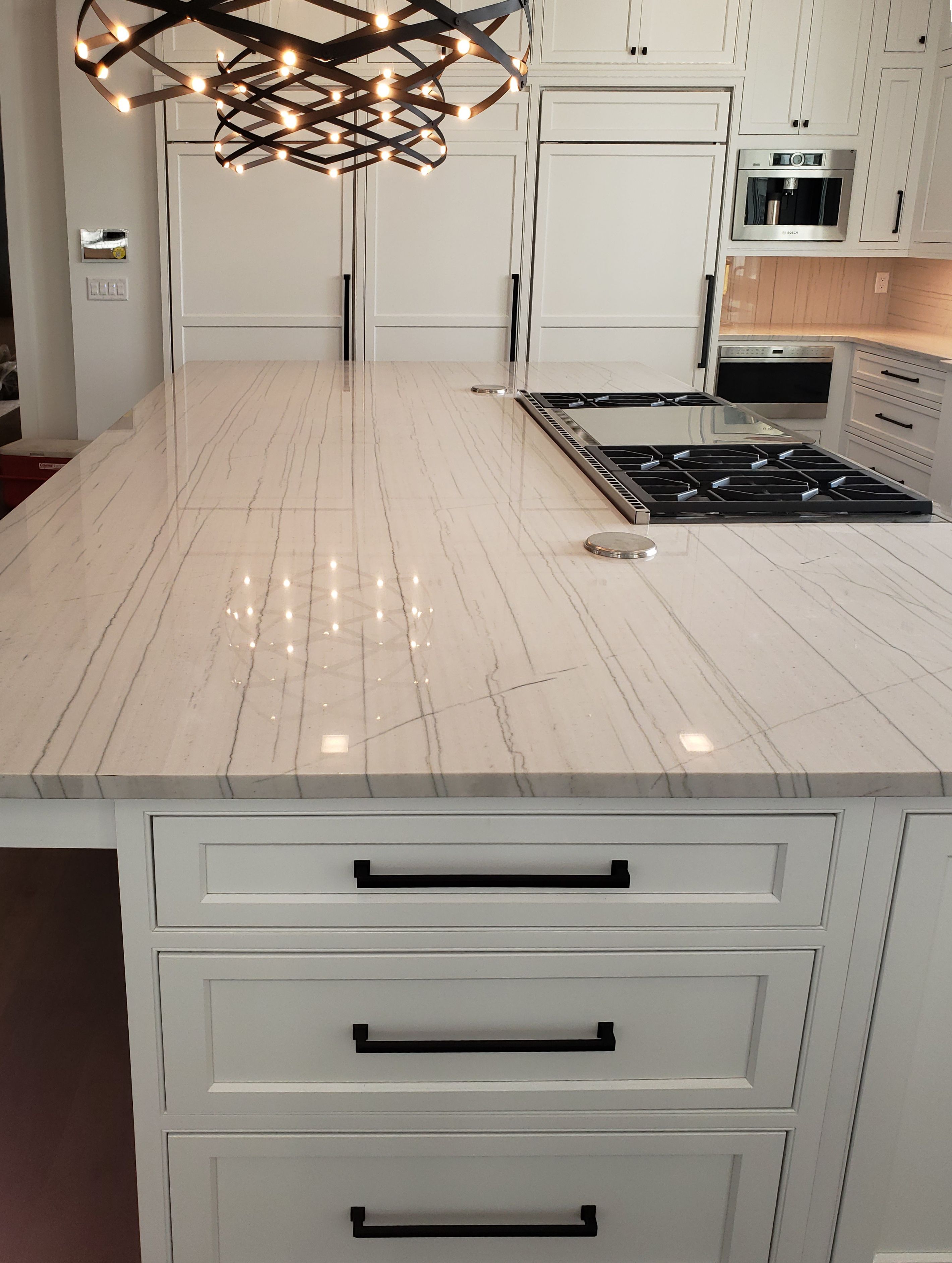 White Macaubas quartzite kitchen includes a built-in farmhouse sink, a full-height backsplash around the windows, and pop-ups on the large island. McDermott Top Shop used Slabsmith to align the veining in the island. (Photos courtesy McDermott Top Shop)