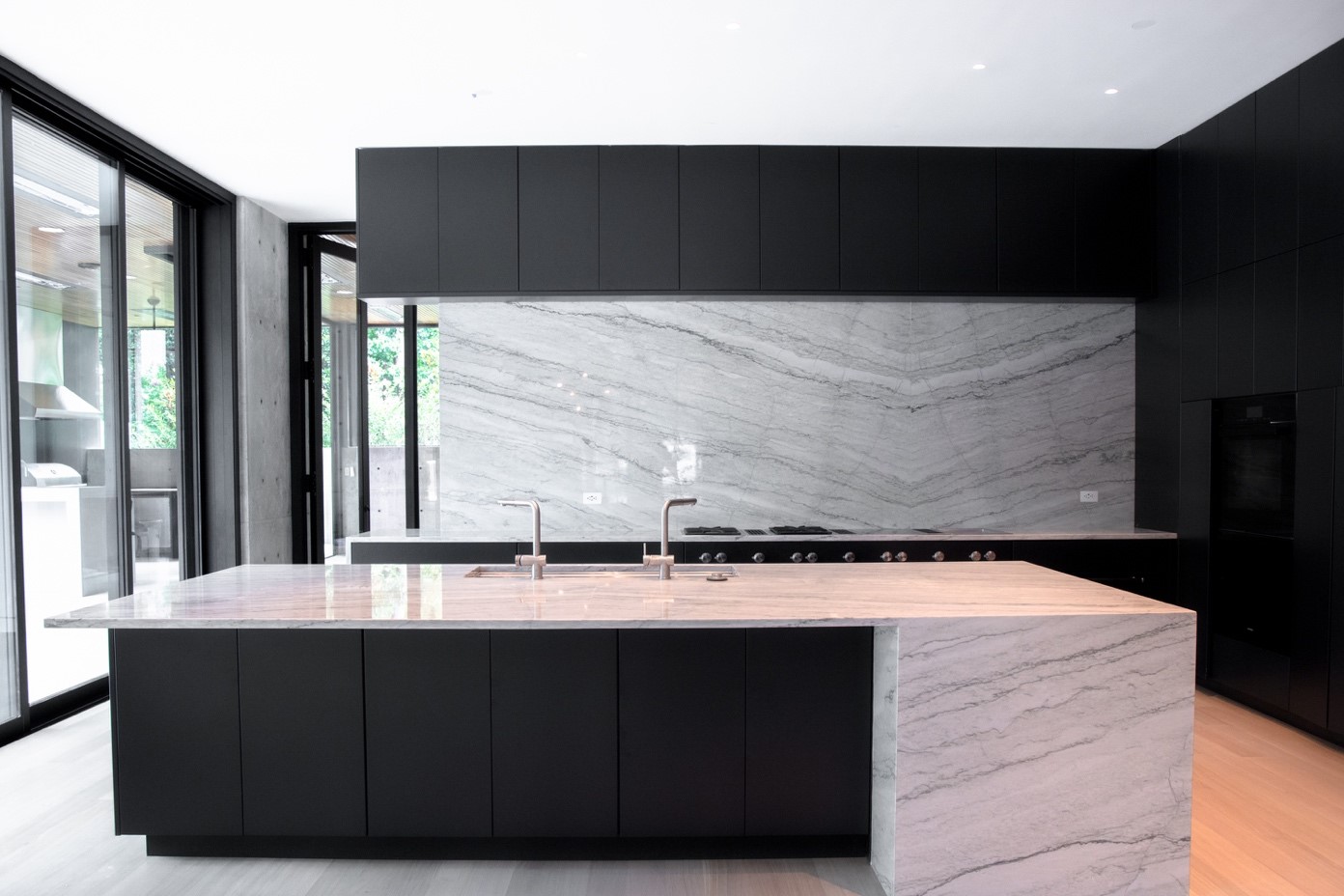 That’s not to say the shop’s move into doing more sintered stone and ultra-compact products was entirely smooth. Not all Grandlienard’s employees were initially enthused about the new materials. “Early on, it was tough,” she says. “I had to have some strong conversations with the team. We have a weekly team session, and everyone has a voice. I told them this was where we were going, but there were concerns about sustainability and about safety.” She also recognizes that change isn’t always easy. Ultimately, she told her staff that these products are part of the future and that anyone not interested in growing with ROCKin’teriors could pick up their last paycheck on Friday. “No one left, and all the mumbling stopped,” Grandlienard says. “We win together, and we lose together, and if there’s a problem, we solve it together. And working with these materials is rewarding. It’s just like artwork.” Just as challenging was figuring out new estimates for labor-per-hour for production and installation. “We had to look at our labor cost versus our stones,” she says. “They all vary but this was significant because of the sintered layer; it takes more time on the machine versus a marble or quartzite.” In some instances, she says it was like quartzite, because of the density of the stone, although it requires a different setup. Both require slowing the psi on the CNC to avoid getting chips everywhere. Nor are all jobs created equal. Grandlienard mentions one project where the client wanted not only a mitered profile build-up for the kitchen island, but they want a return on all sides. By now the company has done enough projects with the materials that it has experience to guide it. And there are other guidelines – if you look. For instance, she says she looked at what Cosentino was charging for premade mitered Dekton sinks that they’re making in Spain. “I kind of looked at their pricing and figured out what it would cost if we were to build it here,” she explains. “It’s been good, because they obviously have an enormous number of resources.” ROCKin’teriors evaluates and reevaluates its pricing structure regularly anyway. Grandlienard also notes that both Dekton and Lapitec have improved their products since the company started working with them. “They’re a little faster cutting, but you still have the same labor putting the miters together,” she says. “There’s more time involved in putting projects together, and the employees are more cautious in how they handle it. You can’t hurry a job.” Still another challenge early on with sintered stone and ultra-compact materials: ROCKin’teriors was ahead of the market. “We had to get clients to believe in this new phenomenon,” says Grandlienard. “Now, we’ve become a go-to for some of the larger projects. And even before we really got serious about making the commitment to sintered stone and ultra-compact materials, we had architects telling us to prepare because these modern designs were coming. “Having those relationships enabled us to be in the forefront,” she adds. The real bottom line is the payoff Grandlienard has seen in making the commitment to fabricate and install these materials the correct way. Not only is ROCKin’teriors able to advertise its ability to work with them, but sales have increased 45% because of that. “It’s been a real game-changer.”