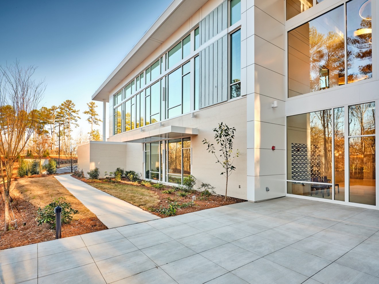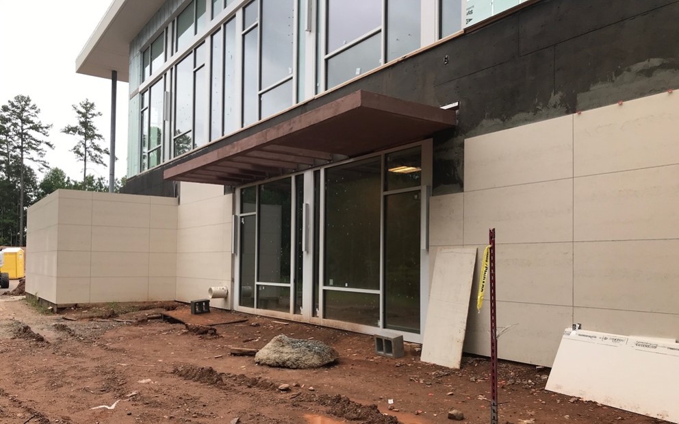 In-the-shop training by manufacturers led to the ability to take on large wall installations and outdoor cladding jobs, like this development-company office building, .