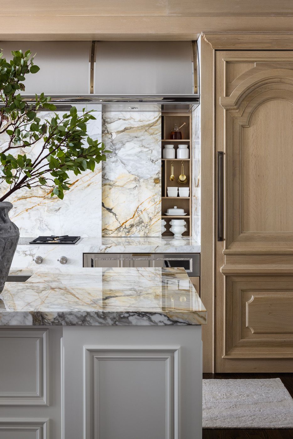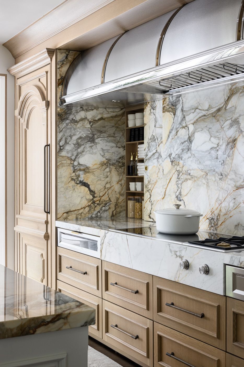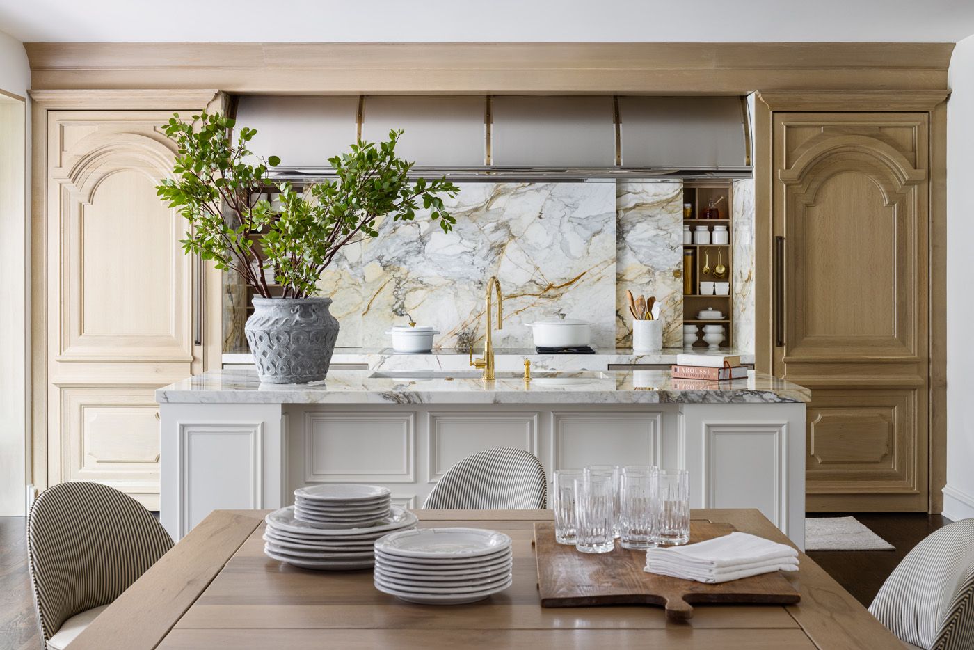 Deeply veined Calacatta Macchia Vecchia marble keeps this expanded kitchen cohesive, as well as framing a large cooking area with an exquisite hood. Custom millwork, bleached wood, brass shelving and bespoke furniture combine with the stone to exude traditional French elegance.