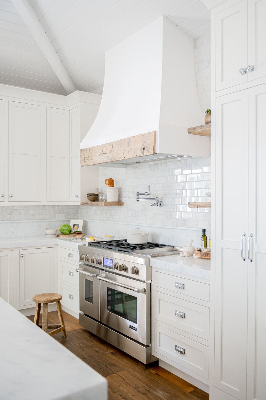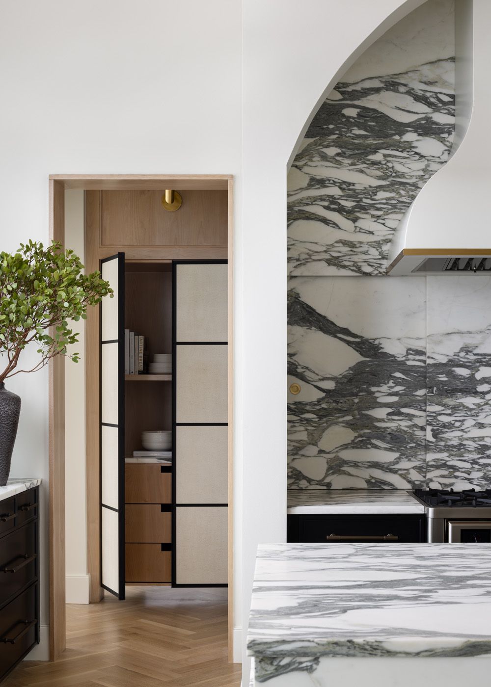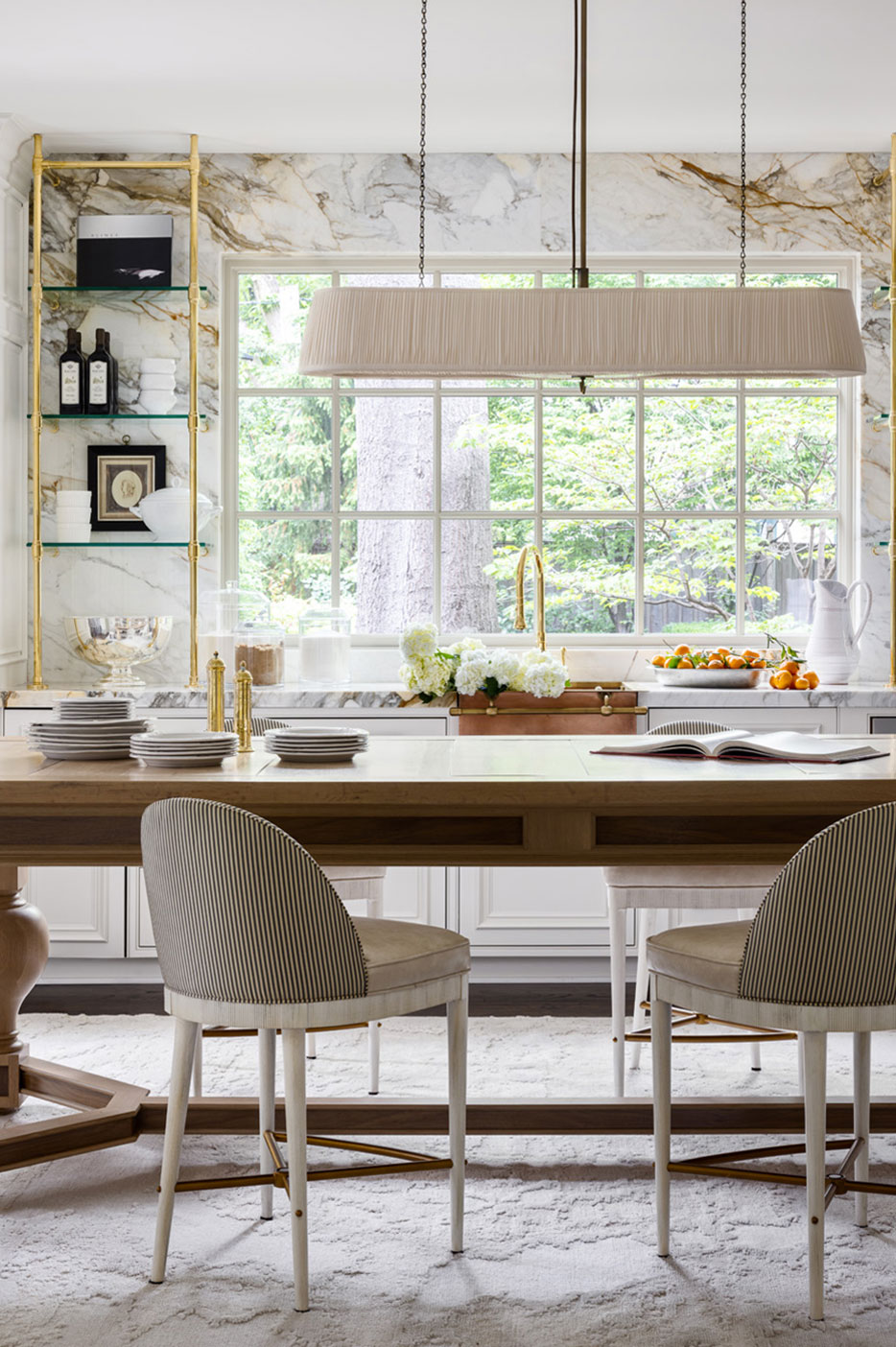 Deeply veined Calacatta Macchia Vecchia marble keeps this expanded kitchen cohesive, as well as framing a large cooking area with an exquisite hood. Custom millwork, bleached wood, brass shelving and bespoke furniture combine with the stone to exude traditional French elegance.