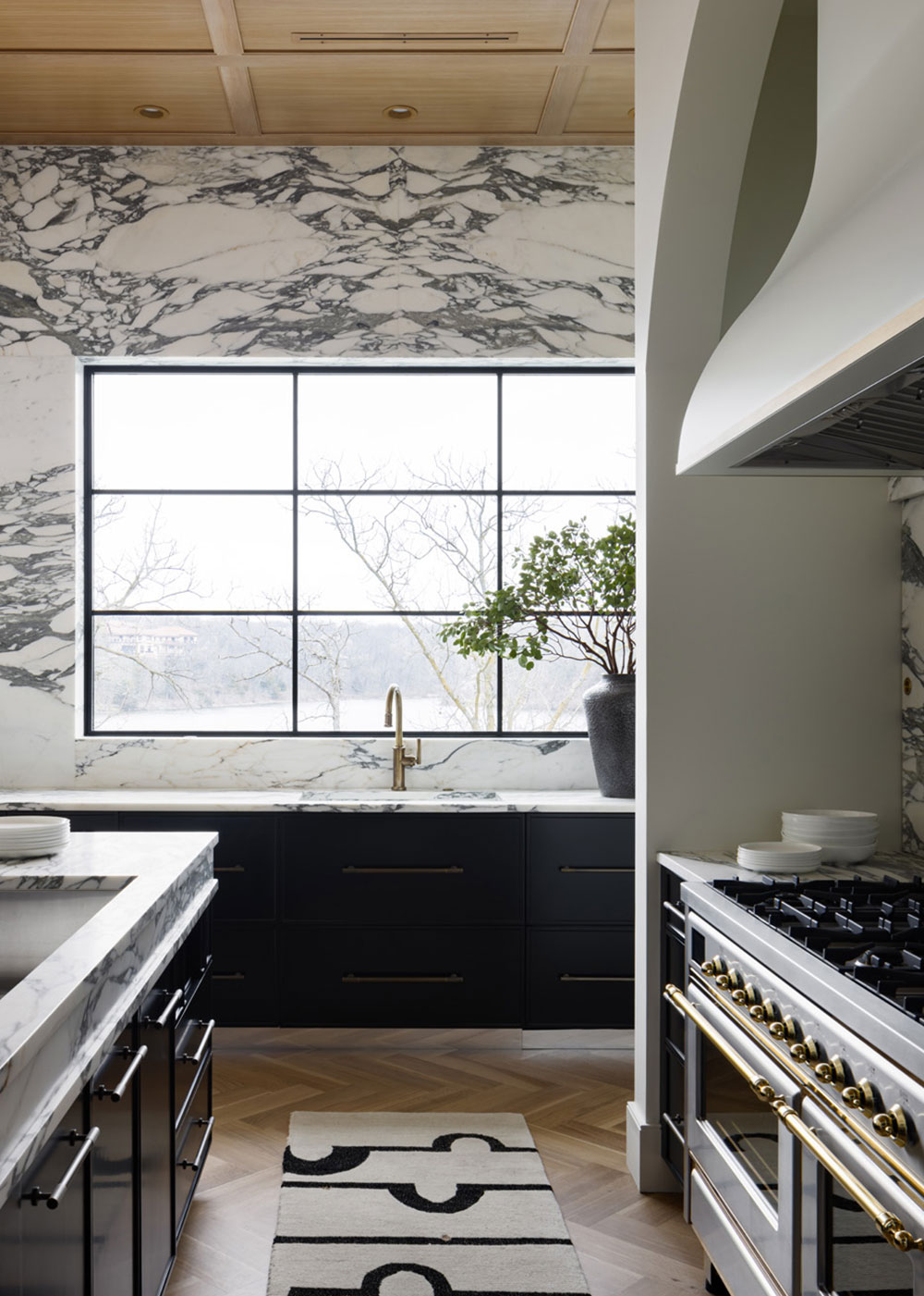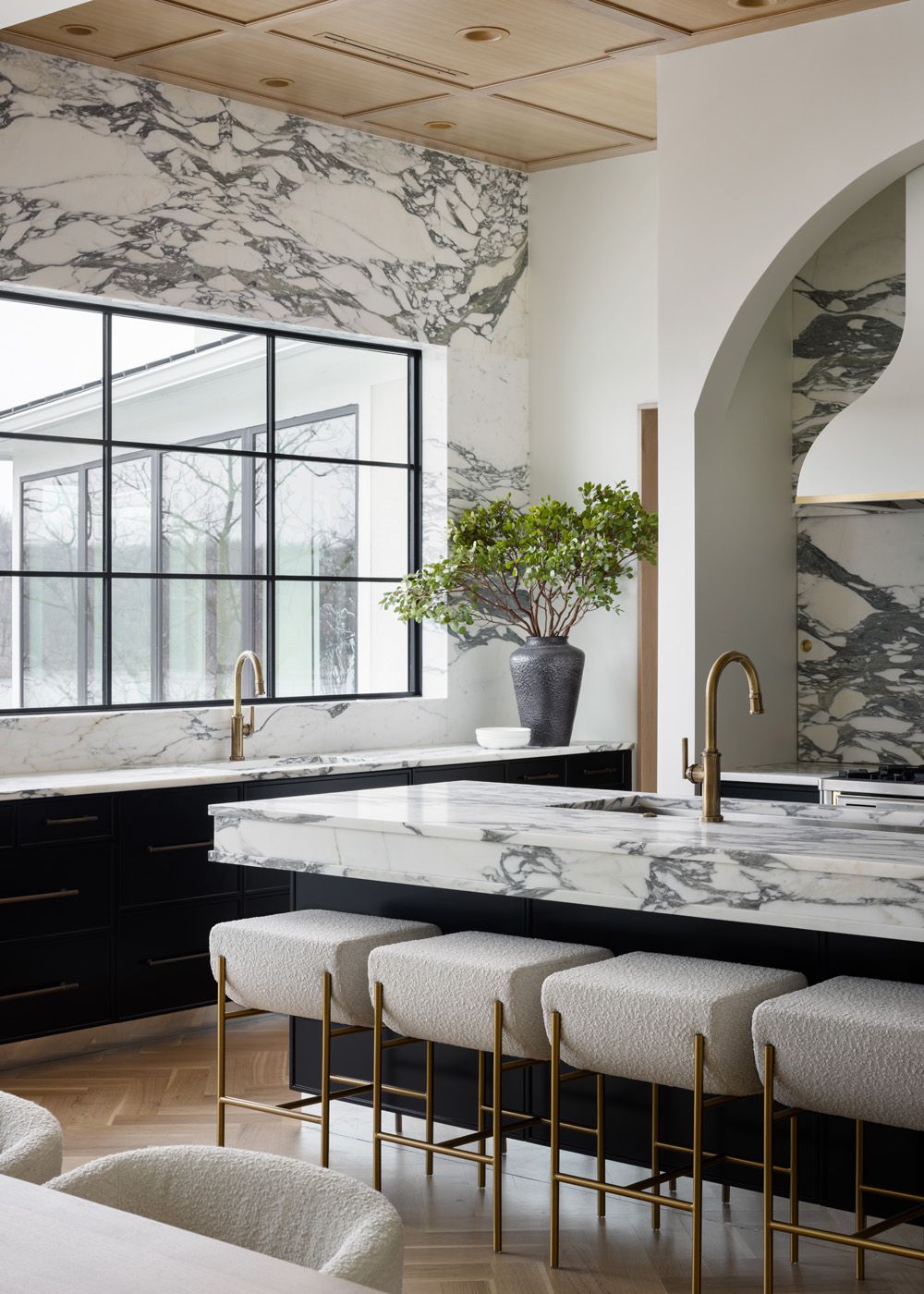 The dramatic use of Arabescato Corchia marble on counters, backsplash, and walls creates a stunning, luxurious statement, including the backdrop to a statment range hood. To take advantage of sweeping lake views, walls of windows are framed by marble, with the rest of the kitchen featuring ample storage, workspace, and state-of the-art amenities, including custom built-ins, integrated appliances, and two generous sinks.