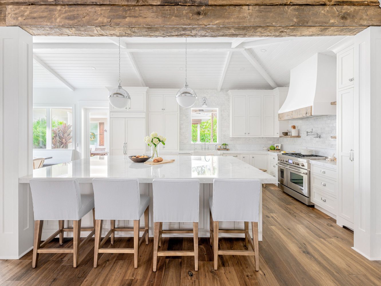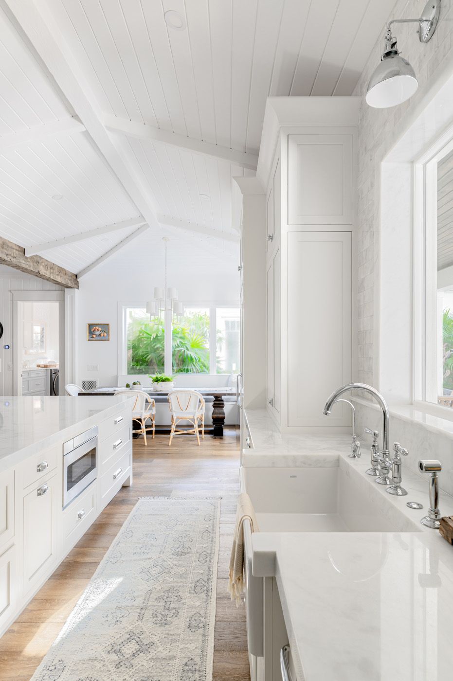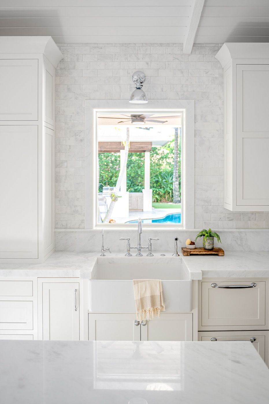 A bright, light, airy coastal kitchen features polished dolomite throughout for countertops. To create an uninterrupted expanse of marble subway-tile backsplash, there are hidden angled electrical outlets under the upper cabinets to power kitchen appliances.