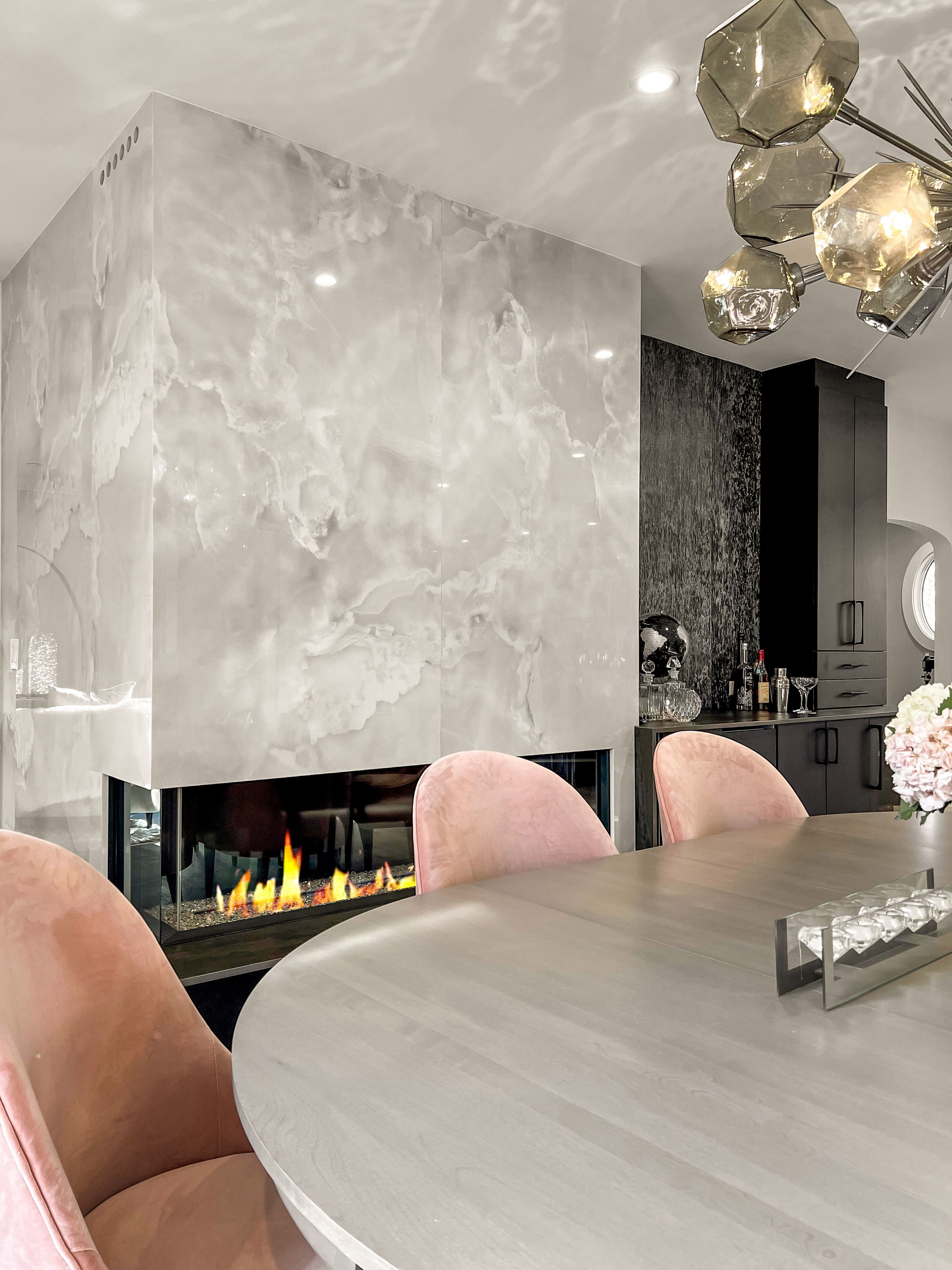 This mitered Dekton® fireplace wraps on three sides. The spacious room has a matching mitered Dekton waterfall countertop tying into the fireplace. (Photos courtesy Italian Marble and Granite)