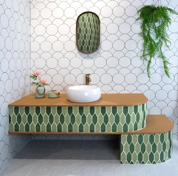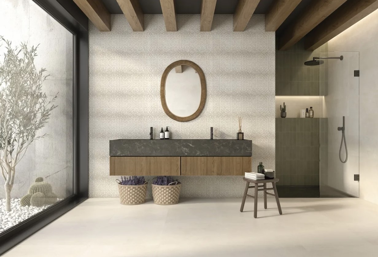 Cobsa’s Japandi collection, shown on the wall in the White Latte option, is accentuated with multi-colorful geometric patterned tile. (Image courtesy Tile of Spain).