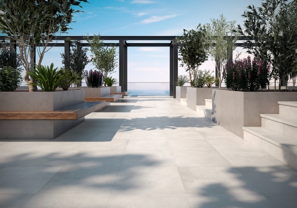 Urban20mm from Gres Aragón is a 20mm-thick porcelain tile where the depth makes it highly resistant and suitable for a myriad of uses. The series, offered in a 60cm X 60cm format in a range of whites, greys, and beiges, can be used indoors or ou, in raised-access floor systems, or laid directly atop grass, sand, or gravel. Further, it can withstand wheeled traffic, making it optimal for terraces, parks, swimming pools, beachside areas, and more. (Image courtesy Gres Aragón)